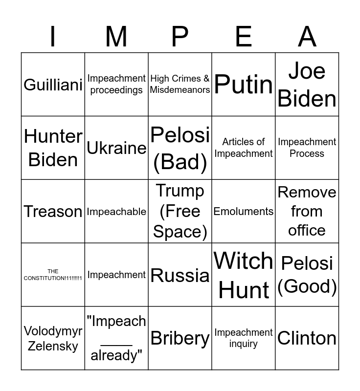 This bingo card has a free space and 24 words: Impeachment, "Impeach ____ already", Pelosi (Bad), Volodymyr Zelensky, Joe Biden, Guilliani, Hunter Biden, Impeachment proceedings, Emoluments, Russia, Articles of Impeachment, Treason, Witch Hunt, Pelosi (Good), Ukraine, Impeachment inquiry, Remove from office, High Crimes & Misdemeanors, Impeachment Process, Impeachable, Clinton, THE CONSTITUTION!11!!!!!1, Putin and Bribery.