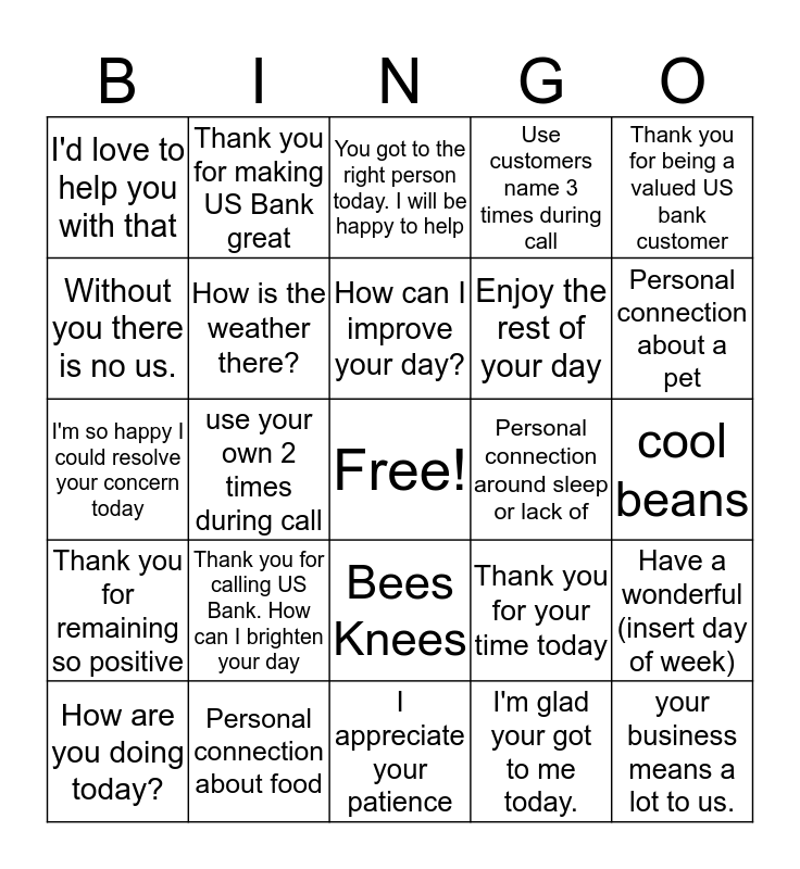 This bingo card has a free space and 24 words: Thank you for calling US Bank. How can I brighten your day, Personal connection about food, How can I improve your day?, How are you doing today?, Thank you for being a valued US bank customer, I'd love to help you with that, Without you there is no us., Thank you for making US Bank great, Personal connection around sleep or lack of, Bees Knees, Enjoy the rest of your day, I'm so happy I could resolve your concern today, Thank you for your time today, Have a wonderful (insert day of week), How is the weather there?, I'm glad your got to me today., cool beans, You got to the right person today. I will be happy to help, Personal connection about a pet, use your own 2 times during call, your business means a lot to us., Thank you for remaining so positive, Use customers name 3 times during call and I appreciate your patience.