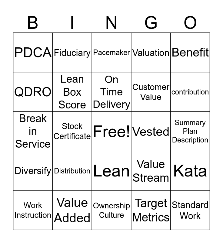 This bingo card has a free space and 39 words: Beneficiary, ESOP, 5S, Value Stream, Kata, Diversify, Stock Certificate, ERISA, Vested, Summary Plan Description, QDRO, Fiduciary, Trust, contribution, Break in Service, Distribution, Lean, Valuation, Participant, Work Instruction, Lean Box Score, On Time Delivery, Target Metrics, Benefit, Communi-cation Committee, Value Added, Ownership Culture, Target Condition, Continuous Improve-ment, PDCA, Huddle, Problem Solving, Customer Value, Standard Work, Flow, Obstacles, Pacemaker, Vision and Quality.