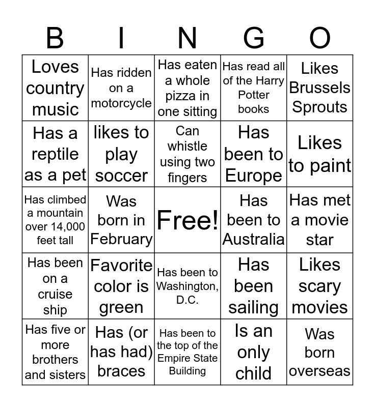 This bingo card has a free space and 46 words: Has been in a helicopter, Was born overseas, Has a birthday in June, Has been to the top of the Empire State Building, Favorite color is green, Can speak two or more languages fluently, Has ridden on a motorcycle, Has been stuck in an elevator, Has a reptile as a pet, Is wearing socks that aren’t black or white, likes to play soccer, Has read all of the Harry Potter books, Likes scary movies, Has been sailing, Has hay fever, Has gone swimming in the ocean, Can whistle using two fingers, Has been to Australia, Is left handed, Likes Brussels Sprouts, Was born in February, Is an only child, Loves country music, Has been to Europe, Speaks another language, Likes to paint, Has five or more brothers and sisters, Is wearing colorful socks, Has been to Washington, D.C., Has been on a cruise ship, Is double-jointed, Has been to three or more continents, Has gone whitewater rafting, Likes Mexican food, Has been to an art museum, Has (or has had) braces, Has met a movie star, Was born in Colorado, Has sleep problems, Flosses teeth daily, Is wearing the same color you have on today (only one color need match), Has eaten a whole pizza in one sitting, Has climbed a mountain over 14,000 feet tall, Has been in a hot air balloon., Has gotten a speeding ticket and Has broken a bone.