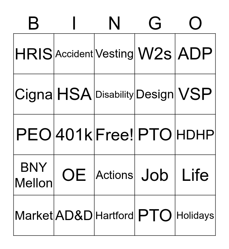 This bingo card has a free space and 29 words: Market, WageWorks, 401k, Dependent, HRIS, Vesting, HSA, OE, PTO, AD&D, HDHP, Holidays, Hartford, PTO, VSP, Simplicity, Actions, BNY Mellon, ADP, PEO, Job, Enroll, Design, Cigna, W2s, Accident, Life, Disability and Dental.