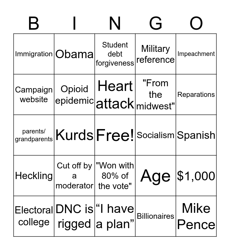 This bingo card has a free space and 24 words: Cut off by a moderator, DNC is rigged, Heart attack, Electoral college, Impeachment, Immigration, Campaign website, Obama, Socialism, "Won with 80% of the vote", "From the midwest", parents/ grandparents, Age, $1,000, Opioid epidemic, Billionaires, Spanish, Student debt forgiveness, Reparations, Kurds, Mike Pence, Heckling, Military reference and “I have a plan”.
