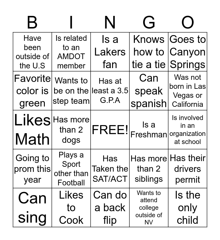 This bingo card has a free space and 24 words: Plays a Sport other than Football, Likes to Cook, Has at least a 3.5 G.P.A, Can sing, Goes to Canyon Springs, Have been outside of the U.S, Favorite color is green, Is related to an AMDOT member, Is a Freshman, Has Taken the SAT/ACT, Can speak spanish, Likes Math, Has more than 2 siblings, Has their drivers permit, Wants to be on the step team, Wants to attend college outside of NV, Is involved in an organization at school, Is a Lakers fan, Was not born in Las Vegas or California, Has more than 2 dogs, Is the only child, Going to prom this year, Knows how to tie a tie and Can do a back flip.