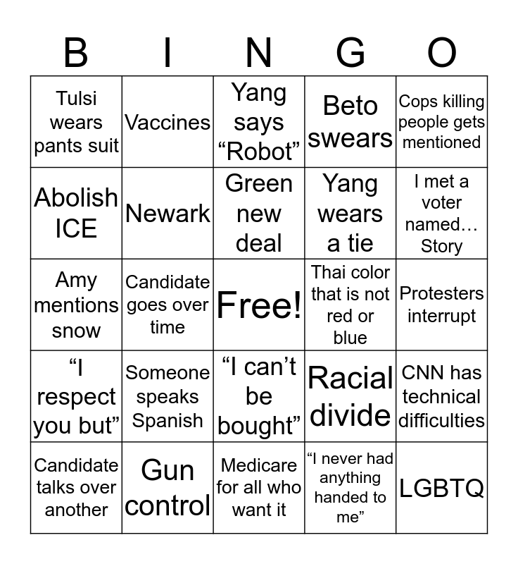This bingo card has a free space and 24 words: Someone speaks Spanish, Gun control, Green new deal, Candidate talks over another, Cops killing people gets mentioned, Tulsi wears pants suit, Abolish ICE, Vaccines, Thai color that is not red or blue, “I can’t be bought”, Yang wears a tie, Amy mentions snow, Racial divide, CNN has technical difficulties, Newark, “I never had anything handed to me”, Protesters interrupt, Yang says “Robot”, I met a voter named… Story, Candidate goes over time, LGBTQ, “I respect you but”, Beto swears and Medicare for all who want it.