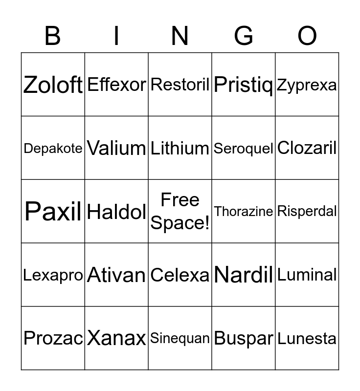 This bingo card has a free space and 24 words: Ativan, Xanax, Lithium, Prozac, Zyprexa, Zoloft, Depakote, Effexor, Thorazine, Celexa, Seroquel, Paxil, Nardil, Luminal, Valium, Buspar, Risperdal, Restoril, Clozaril, Haldol, Lunesta, Lexapro, Pristiq and Sinequan.