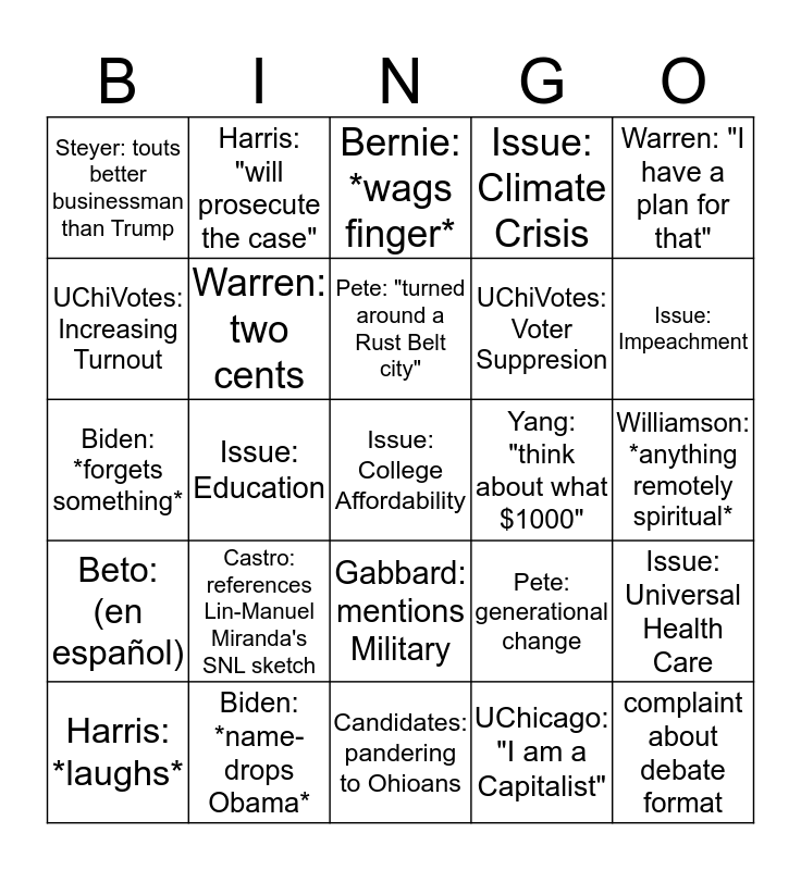 This bingo card has 34 words: complaint about debate format, UChicago: "I am a Capitalist", UChicago: "I am a Socialist", Beto: *swears*, Beto: (en español), Warren: two cents, Warren: "I have a plan for that", Harris: *laughs*, Harris: "will prosecute the case", Booker: "love" or "wholesome", Pete: "turned around a Rust Belt city", Bernie: *wags finger*, anyone mentions Trump, Bernie: says heart attack has made him stronger, Yang: "think about what $1000", Issue: Impeachment, Biden: *name-drops Obama*, Biden: *forgets something*, Castro: references Lin-Manuel Miranda's SNL sketch, Pete: generational change, Gabbard: mentions Military, Klobuchar: touts bipartisanship, Steyer: touts better businessman than Trump, Williamson: *anything remotely spiritual*, Candidates: pandering to Ohioans, Issue: College Affordability, Issue: Climate Crisis, UChiVotes: Youth Turnout, UChiVotes: Voter Suppresion, UChiVotes: Increasing Turnout, Issue: Gun Violence, Issue: Education, Issue: Universal Health Care and Issue: Immigration.