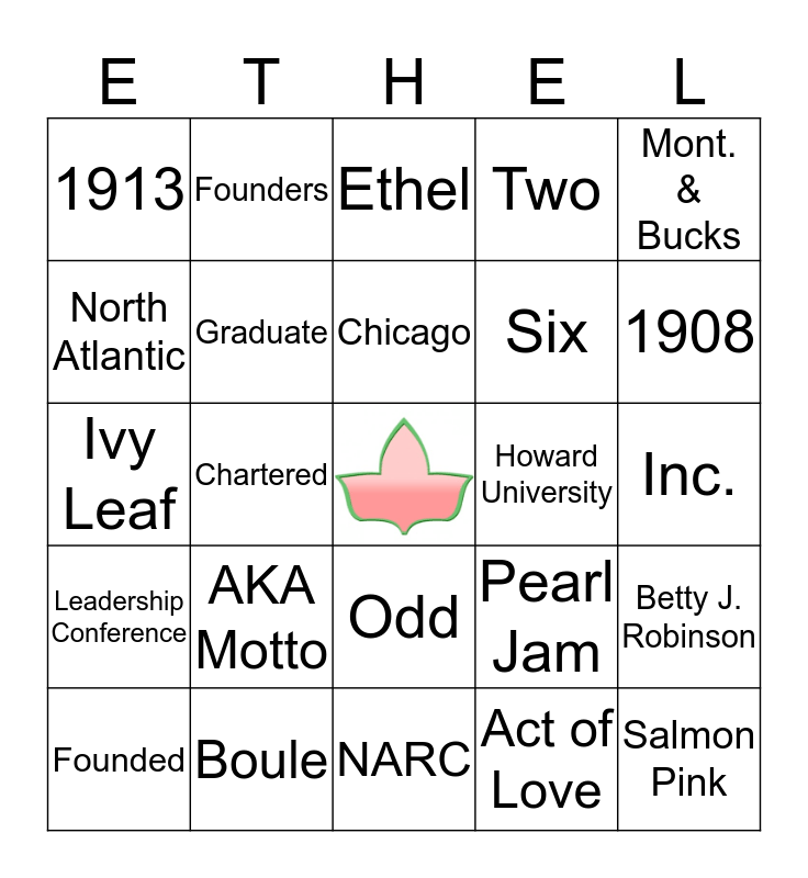 This bingo card has a free space and 24 words: AKA Motto, Boule, Chicago, Founded, Mont. & Bucks, 1913, North Atlantic, Founders, Howard University, Odd, Six, Ivy Leaf, Pearl Jam, Betty J. Robinson, Graduate, Act of Love, Inc., Ethel, 1908, Chartered, Salmon Pink, Leadership Conference, Two and NARC.