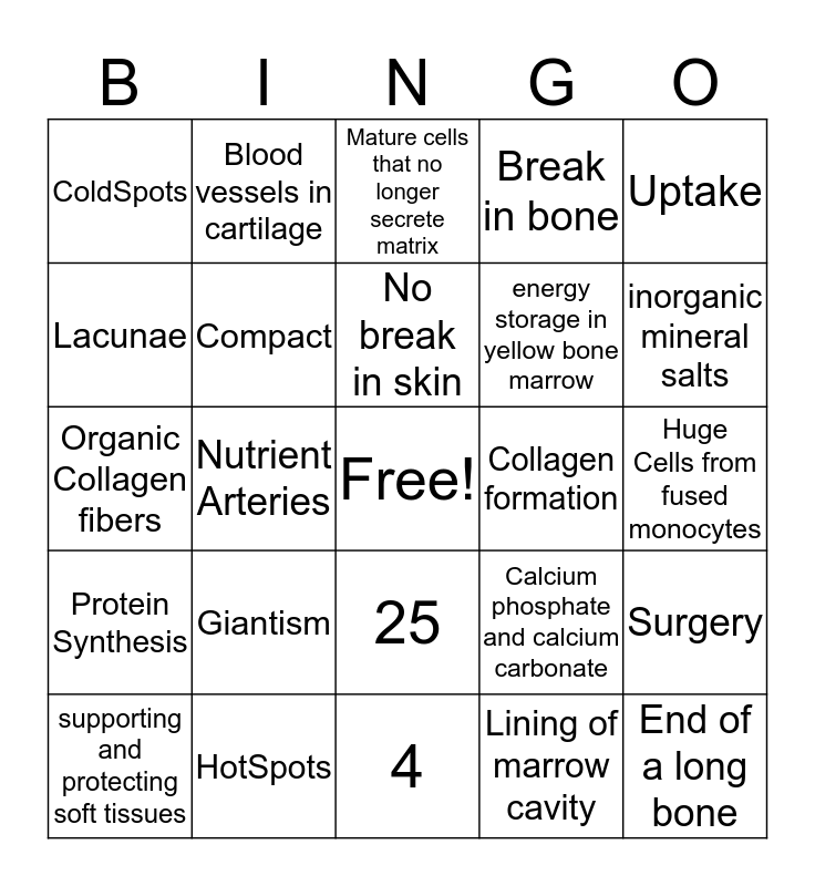 This bingo card has a free space and 29 words: supporting and protecting soft tissues, mesenchyme, Nutrient Arteries, Supply Periosteum, ColdSpots, Mature cells that no longer secrete matrix, Compact, Giantism, Collagen formation, HotSpots, Huge Cells from fused monocytes, End of a long bone, 4, Lining of marrow cavity, inorganic mineral salts, 18-25, 25, Protein Synthesis, Uptake, Organic Collagen fibers, Calcium phosphate and calcium carbonate, compact bone, energy storage in yellow bone marrow, Lacunae, Break in bone, Blood vessels in cartilage, Surgery, No break in skin and skin broken.
