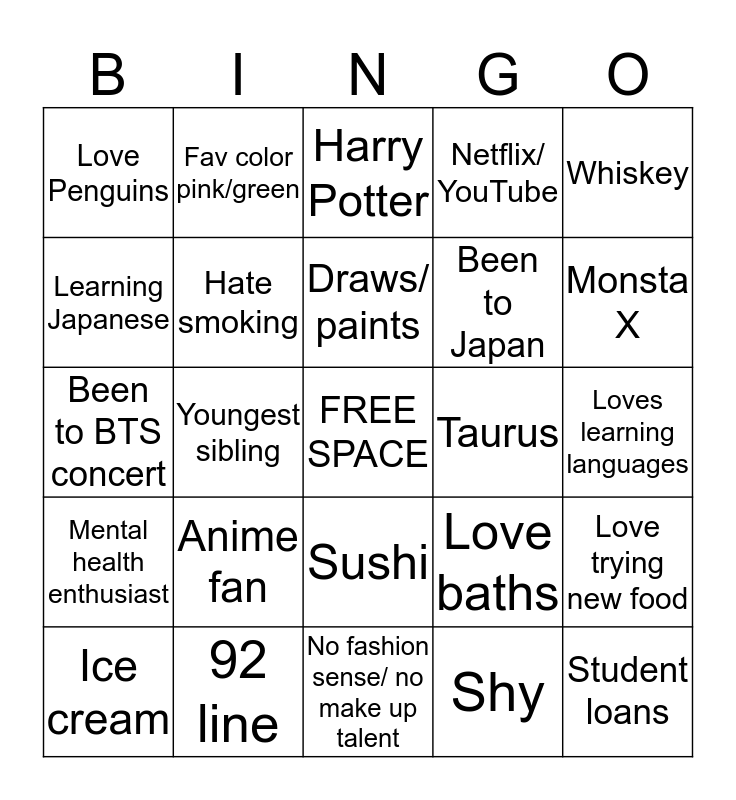 This bingo card has a free space and 24 words: Anime fan, 92 line, Draws/ paints, Ice cream, Whiskey, Love Penguins, Learning Japanese, Fav color pink/green, Taurus, Sushi, Been to Japan, Been to BTS concert, Love baths, Love trying new food, Hate smoking, Shy, Loves learning languages, Harry Potter, Monsta X, Youngest sibling, Student loans, Mental health enthusiast, Netflix/ YouTube and No fashion sense/ no make up talent.