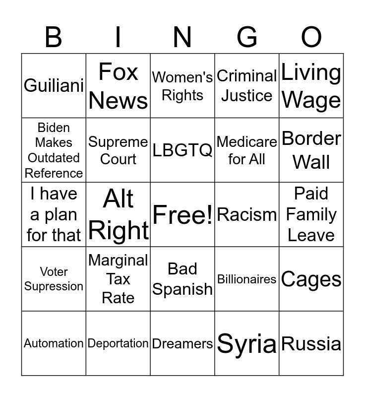 This bingo card has a free space and 29 words: Automation, Ukraine, Alt Right, Impeachment, Guiliani, Women's Rights, Supreme Court, Marginal Tax Rate, Racism, Deportation, Paid Family Leave, Russia, Dreamers, Syria, Border Wall, Trump Tweets, Bad Spanish, Voter Supression, Living Wage, I have a plan for that, Billionaires, Reparations, Medicare for All, Biden Makes Outdated Reference, Criminal Justice, Fox News, Cages, LBGTQ and Obama.