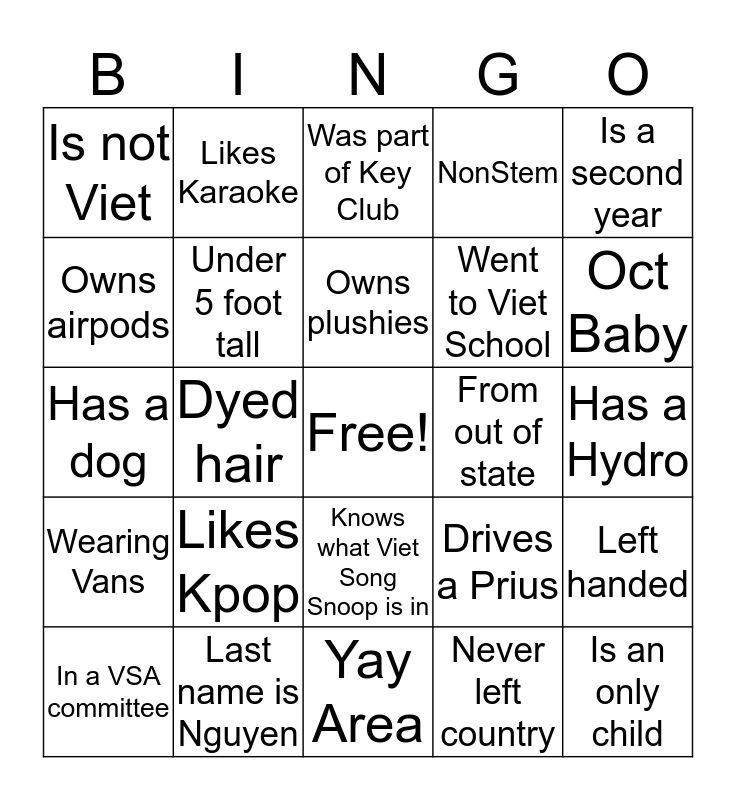 This bingo card has a free space and 24 words: Likes Kpop, Last name is Nguyen, Owns plushies, In a VSA committee, Is a second year, Is not Viet, Owns airpods, Likes Karaoke, From out of state, Knows what Viet Song Snoop is in, Went to Viet School, Has a dog, Drives a Prius, Left handed, Under 5 foot tall, Never left country, Has a Hydro, Was part of Key Club, Oct Baby, Dyed hair, Is an only child, Wearing Vans, NonStem and Yay Area.
