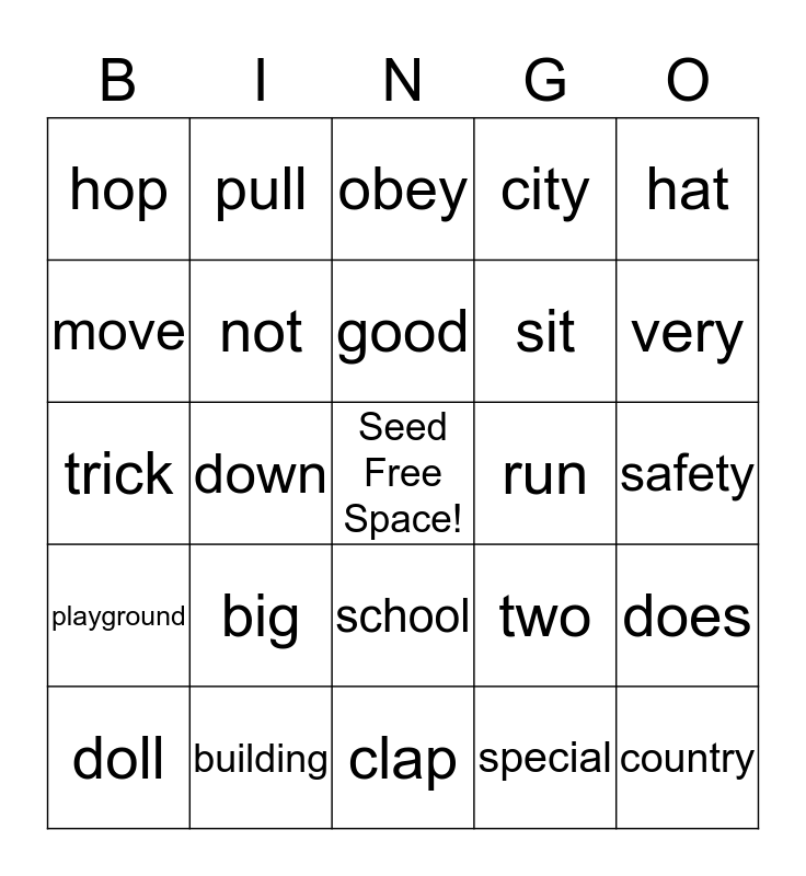 This bingo card has a free space and 25 words: big, clap, good, doll, hat, hop, move, pull, run, school, sit, trick, two, does, not, rules, safety, obey, very, down, country, building, playground, city and special.