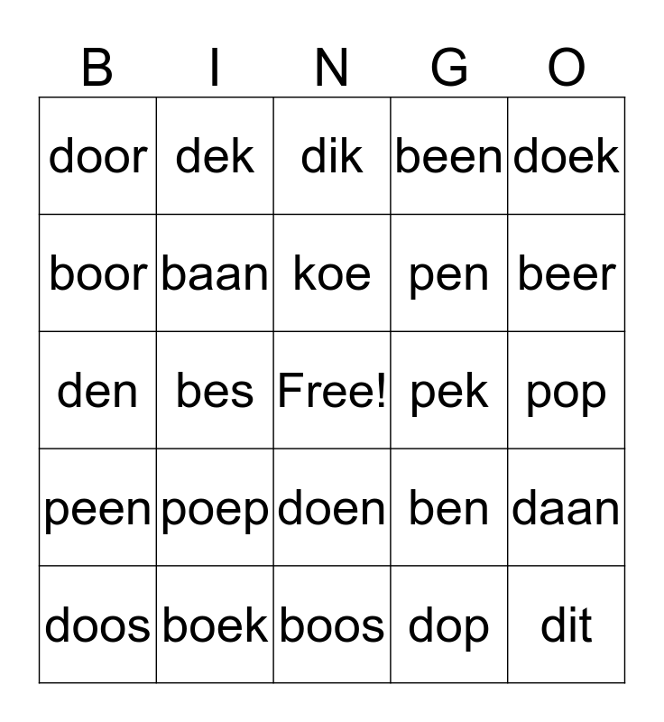 This bingo card has a free space and 24 words: poep, boek, koe, doos, doek, door, boor, dek, pek, doen, pen, den, ben, daan, baan, dop, pop, dik, beer, bes, dit, peen, been and boos.