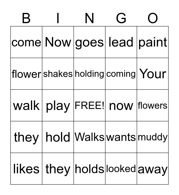 This bingo card has a free space and 24 words: hold, they, holding, likes, paint, come, flower, Now, now, Walks, coming, walk, wants, muddy, shakes, looked, flowers, goes, Your, play, away, they, lead and holds.