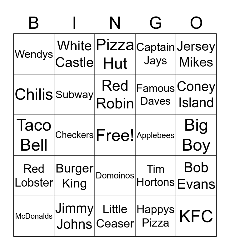 This bingo card has a free space and 24 words: McDonalds, Burger King, Red Robin, Happys Pizza, Jersey Mikes, Wendys, White Castle, Pizza Hut, Applebees, Big Boy, Taco Bell, Subway, Tim Hortons, Bob Evans, Chilis, Jimmy Johns, Little Ceaser, Captain Jays, Coney Island, Red Lobster, Checkers, Domoinos, Famous Daves and KFC.