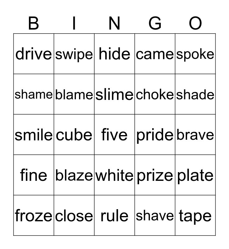 This bingo card has a free space and 24 words: blaze, close, slime, froze, spoke, drive, shame, swipe, pride, white, choke, smile, prize, plate, blame, shave, brave, hide, shade, cube, tape, fine, came and rule.