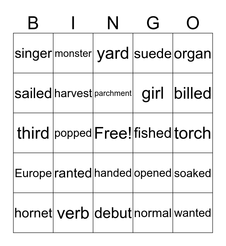 This bingo card has a free space and 24 words: ranted, verb, parchment, hornet, organ, singer, sailed, monster, fished, handed, girl, third, opened, soaked, harvest, normal, torch, yard, billed, popped, wanted, Europe, suede and debut.