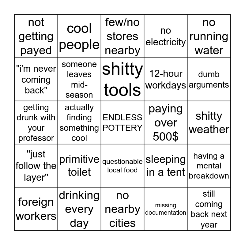This bingo card has a free space and 24 words: primitive toilet, drinking every day, shitty tools, foreign workers, no running water, not getting payed, "i'm never coming back", cool people, paying over 500$, questionable local food, 12-hour workdays, getting drunk with your professor, sleeping in a tent, having a mental breakdown, someone leaves mid-season, missing documentation, shitty weather, few/no stores nearby, dumb arguments, actually finding something cool, still coming back next year, "just follow the layer", no electricity and no nearby cities.