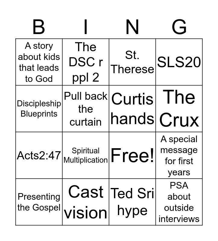 This bingo card has 1 images and 21 words: Cast vision, Fiscal Year things that don’t make sense, The DSC r ppl 2, Thanks for doing your job, Pull back the curtain, Curtis hands, A story about kids that leads to God, St. Therese, Free!, PSA about outside interviews, Acts2:47, SLS20, St. John Henry Newman, Read the Pilot, Ted Sri hype, Dominic Palucci, A special message for first years, Presenting the Gospel, Spiritual Multiplication, Discipleship Blueprints and The Crux.