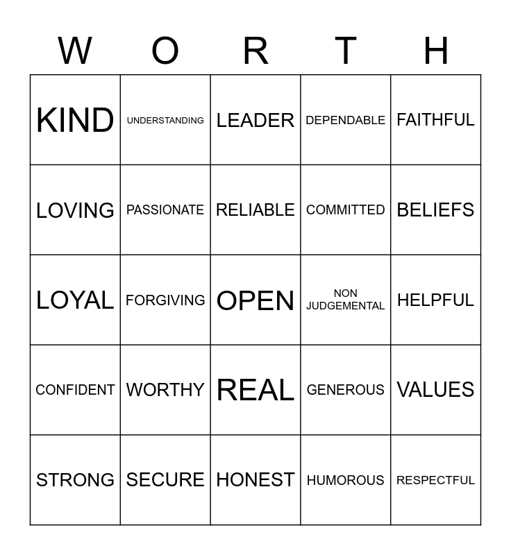 This bingo card has 25 words: WORTHY, HONEST, RELIABLE, STRONG, FAITHFUL, KIND, LOVING, UNDERSTANDING, NON JUDGEMENTAL, REAL, COMMITTED, LOYAL, GENEROUS, VALUES, PASSIONATE, RESPECTFUL, HELPFUL, LEADER, BELIEFS, FORGIVING, OPEN, SECURE, CONFIDENT, DEPENDABLE and HUMOROUS.