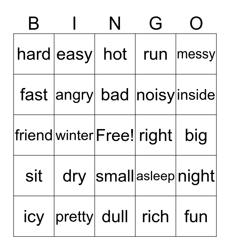This bingo card has a free space and 24 words: dry, pretty, bad, icy, messy, hard, fast, easy, right, small, noisy, friend, asleep, night, angry, rich, big, hot, inside, winter, fun, sit, run and dull.