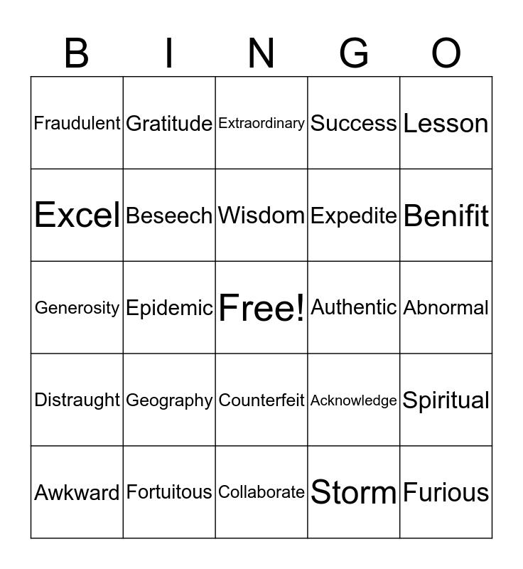 This bingo card has a free space and 29 words: Awkward, Catastrophe, Epidemic, Abstract, Fraudulent, Extraordinary, Beseech, Geography, Authentic, Fortuitous, Abnormal, Furious, Collaborate, Storm, Benifit, Frequent, Counterfeit, Distraught, Lesson, Generosity, Acknowledge, Accurate, Expedite, Excel, Success, Gratitude, Spiritual, Wisdom and Scholarship.