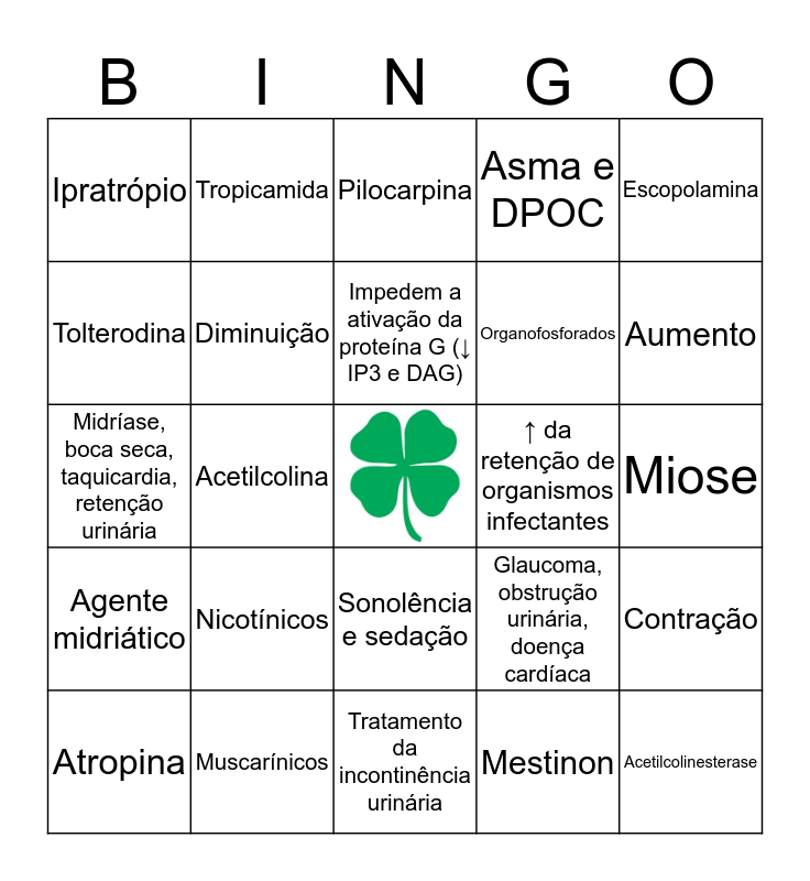 This bingo card has a free space and 24 words: Nicotínicos, Muscarínicos, Impedem a ativação da proteína G (↓ IP3 e DAG), Atropina, Escopolamina, Ipratrópio, Tolterodina, Tropicamida, ↑ da retenção de organismos infectantes, Sonolência e sedação, Organofosforados, Midríase, boca seca, taquicardia, retenção urinária, Glaucoma, obstrução urinária, doença cardíaca, Contração, Diminuição, Mestinon, Miose, Pilocarpina, Aumento, Acetilcolina, Acetilcolinesterase, Agente midriático, Asma e DPOC and Tratamento da incontinência urinária.