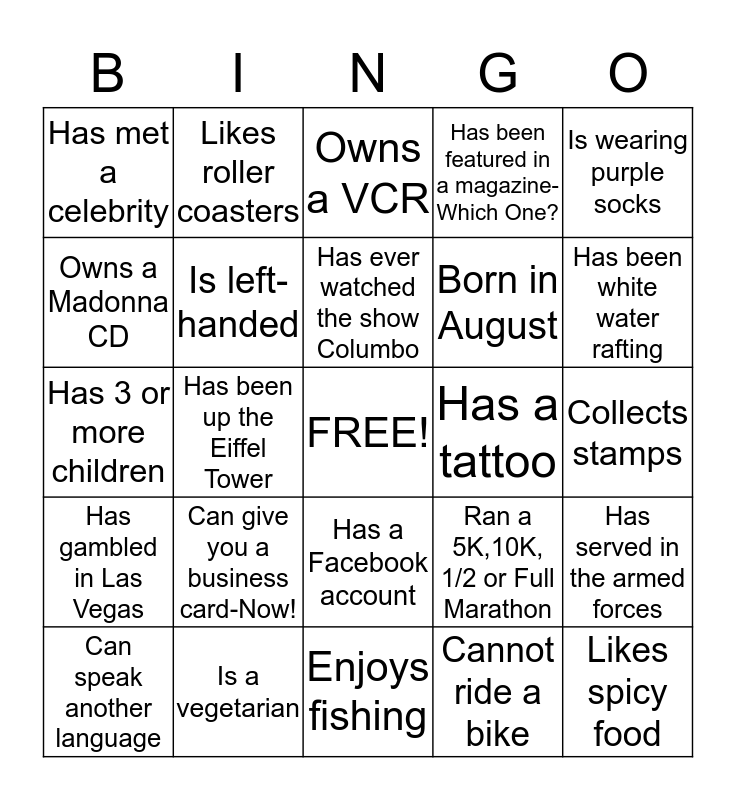 This bingo card has a free space and 24 words: Can give you a business card-Now!, Is a vegetarian, Has ever watched the show Columbo, Can speak another language, Is wearing purple socks, Has met a celebrity, Owns a Madonna CD, Likes roller coasters, Has a tattoo, Has a Facebook account, Born in August, Has 3 or more children, Ran a 5K,10K, 1/2 or Full Marathon, Has served in the armed forces, Is left-handed, Cannot ride a bike, Collects stamps, Owns a VCR, Has been white water rafting, Has been up the Eiffel Tower, Likes spicy food, Has gambled in Las Vegas, Has been featured in a magazine-Which One? and Enjoys fishing.
