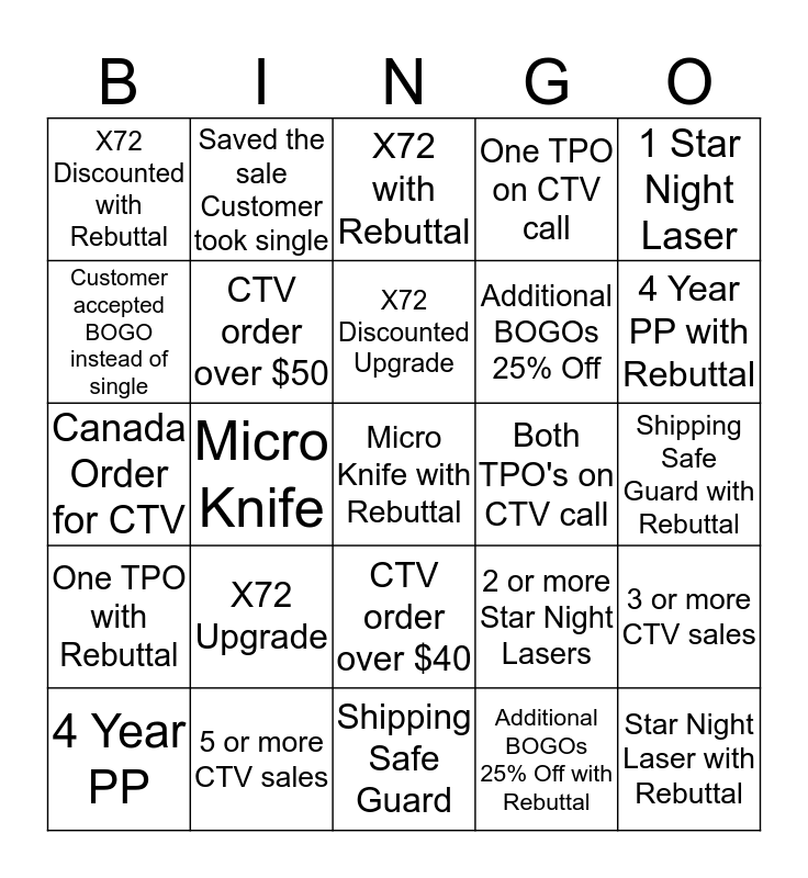This bingo card has 25 words: X72 Upgrade, Shipping Safe Guard, X72 Discounted Upgrade, 4 Year PP, 1 Star Night Laser, X72 Discounted with Rebuttal, Customer accepted BOGO instead of single, Saved the sale Customer took single, Both TPO's on CTV call, CTV order over $40, Additional BOGOs 25% Off, Canada Order for CTV, 2 or more Star Night Lasers, 3 or more CTV sales, CTV order over $50, Star Night Laser with Rebuttal, Shipping Safe Guard with Rebuttal, X72 with Rebuttal, 4 Year PP with Rebuttal, Micro Knife, Micro Knife with Rebuttal, 5 or more CTV sales, One TPO with Rebuttal, One TPO on CTV call and Additional BOGOs 25% Off with Rebuttal.