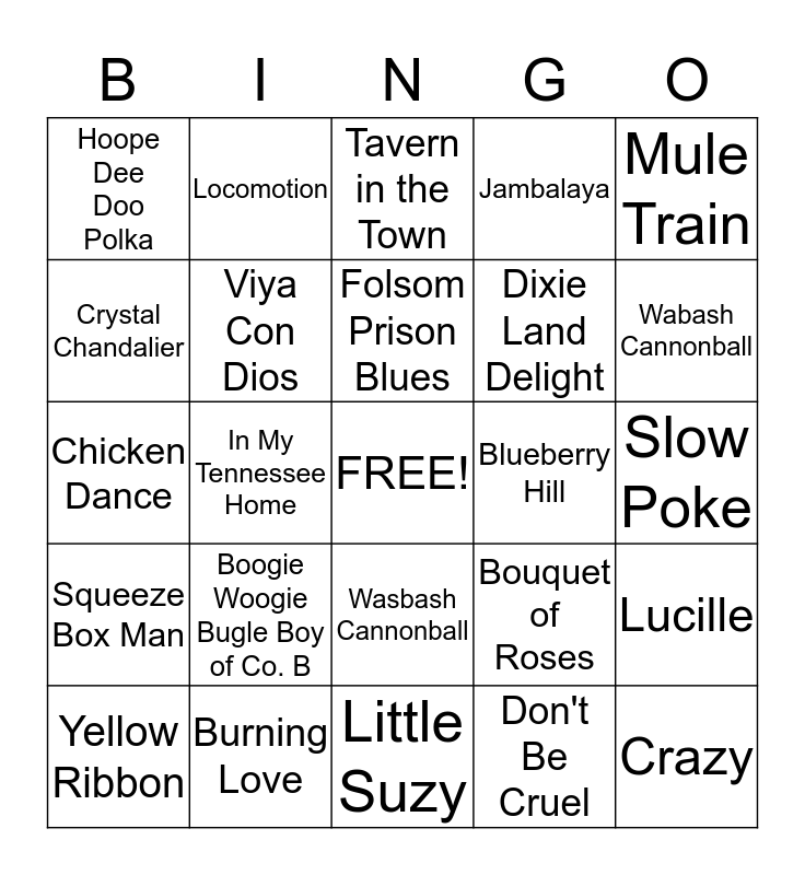 This bingo card has a free space and 52 words: The Streak, Crazy, Tennessee Waltze, Little Suzy, Boogie Woogie Bugle Boy of Co. B, Hay Good Looking, Locomotion, Walk the Line, Crystal Chandalier, 500 Miles Away From Home, Viya Con Dios, Broken Hearted Me, Lucille, Bouquet of Roses, Rocky Top, Ruby Don't Take Your Love to Town Town, Folsom Prison Blues, Blueberry Hill, You Are My Sunshine, Mule Train, In My Tennessee Home, Don't Be Cruel, Hoope Dee Doo Polka, Dixie Land Delight, Wolverton Mountain, North to Alaska, Islands in the Stream, Coal Miners Daughter, Wabash Cannonball, Yellow Rose of Texas, HaveI toldyou Lately, Jambalaya, Whispering Hope, Circle be Unbroken, Love Letters inthe Sand, Tavern in the Town, Burning Love, Sincerely, Banana Boat Song, Thank God I'ma Countryboy, Sugartime, Slow Poke, Squeeze Box Man, I fall to Pieces, Wasbash Cannonball, This Land is your Land, Happy Wanderer, Chicken Dance, I Saw The Light, Anytime, Yellow Ribbon and Green Grass of Home.