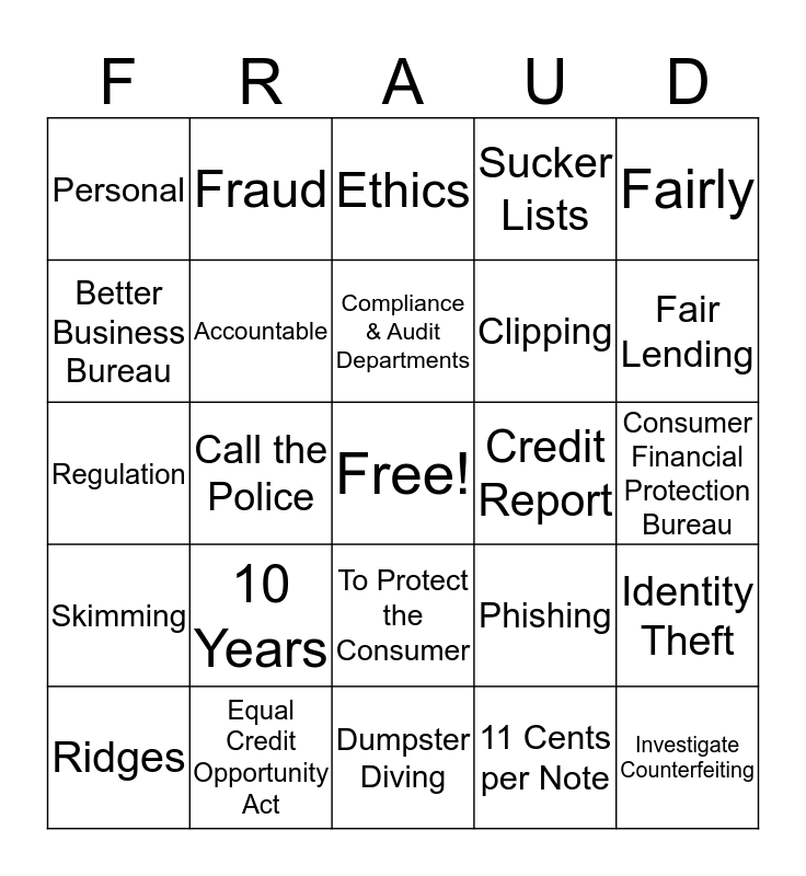 This bingo card has a free space and 30 words: Scam, Equal Credit Opportunity Act, Ethics, Government, Fairly, Personal, Accountable, Compliance & Audit Departments, Clipping, Investigate Counterfeiting, Ridges, 10 Years, 11 Cents per Note, Cotton and Linen, Skimming, Shred, Dumpster Diving, Credit Report, Identity Theft, Better Business Bureau, Call the Police, Safe Deposit Box, Sucker Lists, Consumer Financial Protection Bureau, Regulation, Fraud, To Protect the Consumer, Phishing, Fair Lending and Poor Spelling & Grammar.