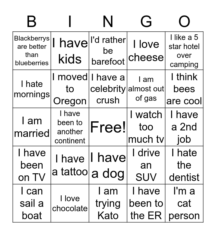 This bingo card has a free space and 24 words: I have a tattoo, I love chocolate, I have a celebrity crush, I can sail a boat, I like a 5 star hotel over camping, Blackberrys are better than blueberries, I hate mornings, I have kids, I watch too much tv, I have a dog, I am almost out of gas, I am married, I drive an SUV, I hate the dentist, I moved to Oregon, I have been to the ER, I have a 2nd job, I'd rather be barefoot, I think bees are cool, I have been to another continent, I'm a cat person, I have been on TV, I love cheese and I am trying Kato.