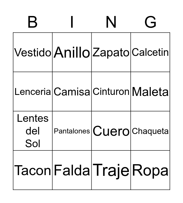 This bingo card has 28 words: Bota, Paraguas, Lentes del Sol, Joyeria, Camisa, Zapato, Anillo, Ropa, Falda, Camisieta, Cuero, Calcetin, Bolsa, Bolso, Pantalones, Maquillaje, Sombrero, Cinturon, Maleta, Abrigo, Vestido, Guante, Tacon, Chaqueta, Traje, Uniforme, Lenceria and Vaqueros.