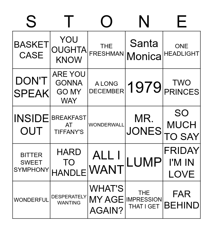 This bingo card has 46 words: UNDER THE BRIDGE, WONDERWALL, WHEN I COME AROUND, WHAT'S MY AGE AGAIN?, HARD TO HANDLE, SEMI-CHARMED LIFE, YOU OUGHTA KNOW, DRIVE, DON'T SPEAK, INTERSTATE LOVE SONG, ARE YOU GONNA GO MY WAY, Santa Monica, FRIDAY I'M IN LOVE, LUMP, HOOK, LOSING MY RELIGION, A LONG DECEMBER, MR. JONES, PARADISE CITY, ONE HEADLIGHT, BREAKFAST AT TIFFANY'S, THE IMPRESSION THAT I GET, BASKET CASE, 1979, NO RAIN, TWO PRINCES, WONDERFUL, HEY JEALOUSY, ALL I WANT, BITTER SWEET SYMPHONY, SLIDE, ONLY WANNA BE WITH YOU, RUN AROUND, LOSER, ALL FOR YOU, DESPERATELY WANTING, SO MUCH TO SAY, WHAT WOULD YOU SAY, BETTER DAYS, COUNTING BLUE CARS, FAR BEHIND, THE FRESHMAN, INSIDE OUT, FATHER OF MINE, ROLL TO ME and ONE WEEK.