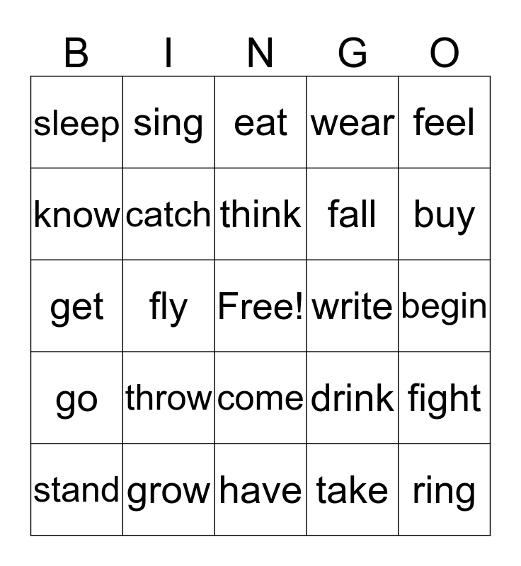 This bingo card has a free space and 24 words: throw, grow, think, stand, feel, sleep, know, sing, write, come, fall, get, drink, fight, catch, take, begin, eat, buy, fly, ring, go, wear and have.