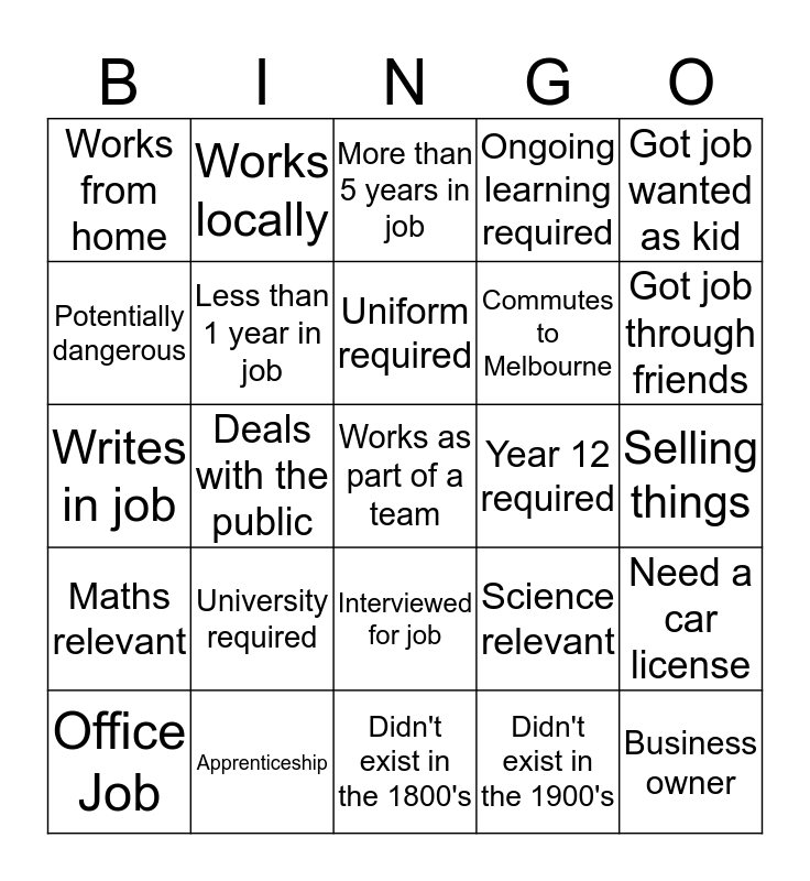 This bingo card has a free space and 29 words: Office Job, Outdoor Job, Deals with the public, Government job, Works from home, More than 5 years in job, Less than 1 year in job, University required, Year 12 required, Apprenticeship, Selling things, Business owner, Didn't exist in the 1800's, Didn't exist in the 1900's, Got job through friends, Got job through family, Interviewed for job, Maths relevant, Got job wanted as kid, Writes in job, Science relevant, Shift worker, Commutes to Melbourne, Potentially dangerous, Ongoing learning required, Works locally, Need a car license, Uniform required and Criminal record check.