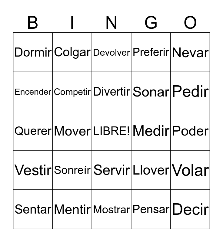 This bingo card has a free space and 24 words: Sonreír, Mentir, Divertir, Sentar, Nevar, Dormir, Encender, Colgar, Medir, Servir, Sonar, Querer, Llover, Volar, Competir, Pensar, Poder, Devolver, Pedir, Mover, Decir, Vestir, Preferir and Mostrar.