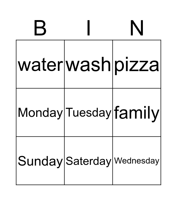 This bingo card has a free space and 11 words: afternoon, bathroom, family, Sunday, pizza, water, Saterday, Friday, Monday, wash and Wednesday.