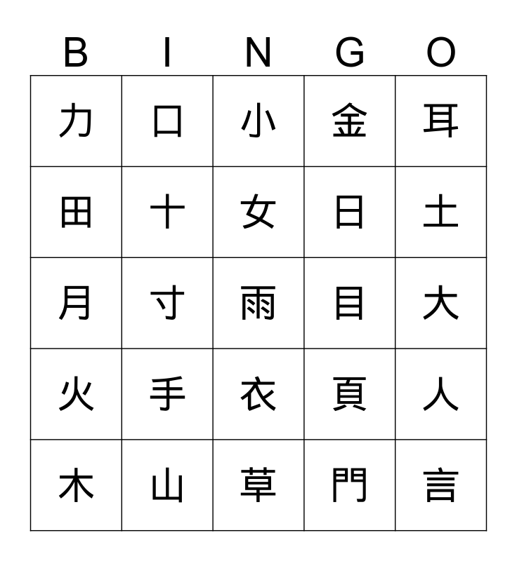 This bingo card has 25 words: 手, 草, 女, 木, 耳, 力, 田, 口, 目, 衣, 日, 月, 頁, 人, 十, 言, 大, 小, 土, 寸, 雨, 山, 火, 金 and 門.