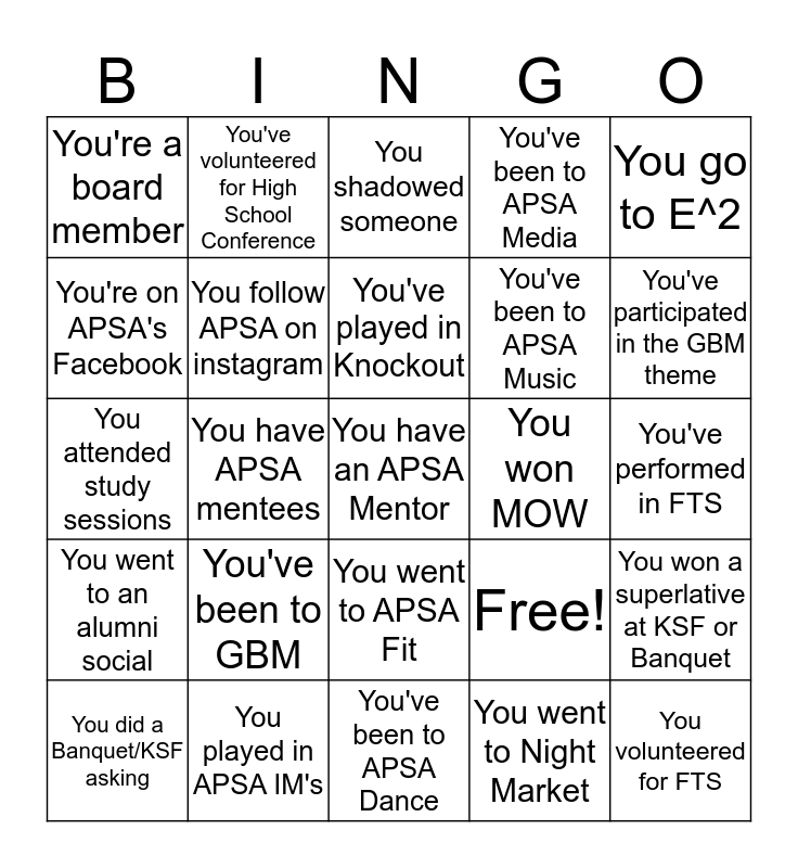 This bingo card has 25 words: You've been to GBM, You've been to APSA Dance, You've played in Knockout, You did a Banquet/KSF asking, You go to E^2, You're a board member, You're on APSA's Facebook, You've volunteered for High School Conference, You won MOW, You went to APSA Fit, You've been to APSA Music, You attended study sessions, Free!, You won a superlative at KSF or Banquet, You follow APSA on instagram, You volunteered for FTS, You've performed in FTS, You shadowed someone, You've participated in the GBM theme, You have APSA mentees, You have an APSA Mentor, You played in APSA IM's, You went to an alumni social, You've been to APSA Media and You went to Night Market.