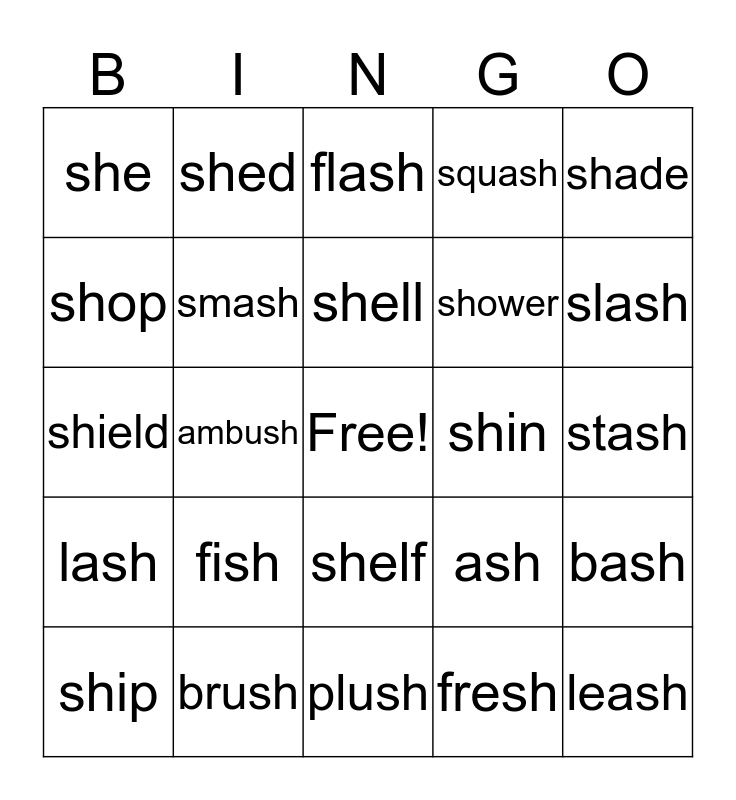 This bingo card has a free space and 24 words: fish, brush, shell, ship, shade, she, shop, shed, shin, shelf, shower, shield, ash, bash, smash, fresh, stash, flash, slash, ambush, leash, lash, squash and plush.
