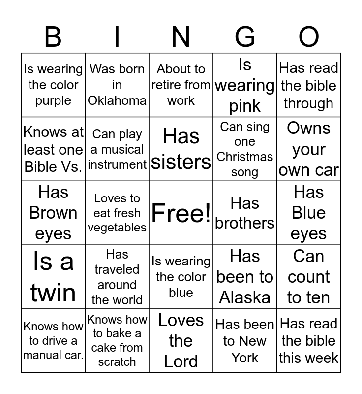 This bingo card has a free space and 24 words: Has traveled around the world, Knows how to bake a cake from scratch, Has sisters, Knows how to drive a manual car., Has read the bible through, Is wearing the color purple, Knows at least one Bible Vs., Was born in Oklahoma, Has brothers, Is wearing the color blue, Can sing one Christmas song, Has Brown eyes, Has been to Alaska, Can count to ten, Can play a musical instrument, Has been to New York, Has Blue eyes, About to retire from work, Owns your own car, Loves to eat fresh vegetables, Has read the bible this week, Is a twin, Is wearing pink and Loves the Lord.