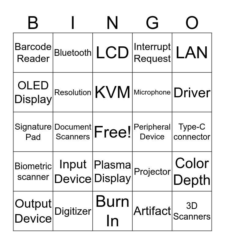 This bingo card has a free space and 24 words: Input Device, Digitizer, KVM, Output Device, LAN, Barcode Reader, OLED Display, Bluetooth, Peripheral Device, Plasma Display, Microphone, Signature Pad, Projector, Color Depth, Resolution, Artifact, Type-C connector, LCD, Driver, Document Scanners, 3D Scanners, Biometric scanner, Interrupt Request and Burn In.