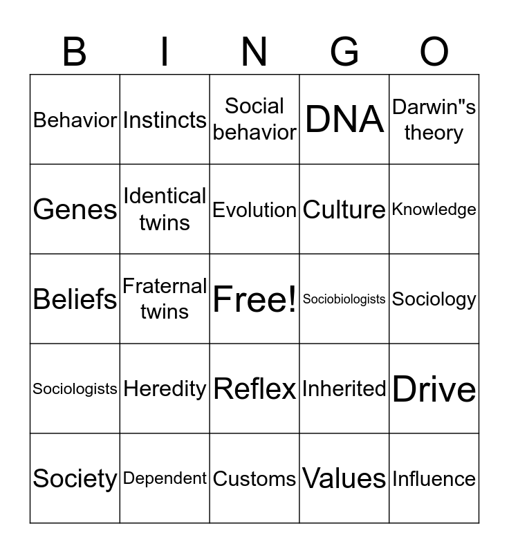This bingo card has a free space and 24 words: Society, Heredity, Evolution, Values, Darwin"s theory, Behavior, Instincts, Social behavior, Sociobiologists, Sociology, Beliefs, Identical twins, Inherited, Drive, Genes, Dependent, Customs, DNA, Knowledge, Sociologists, Fraternal twins, Reflex, Culture and Influence.