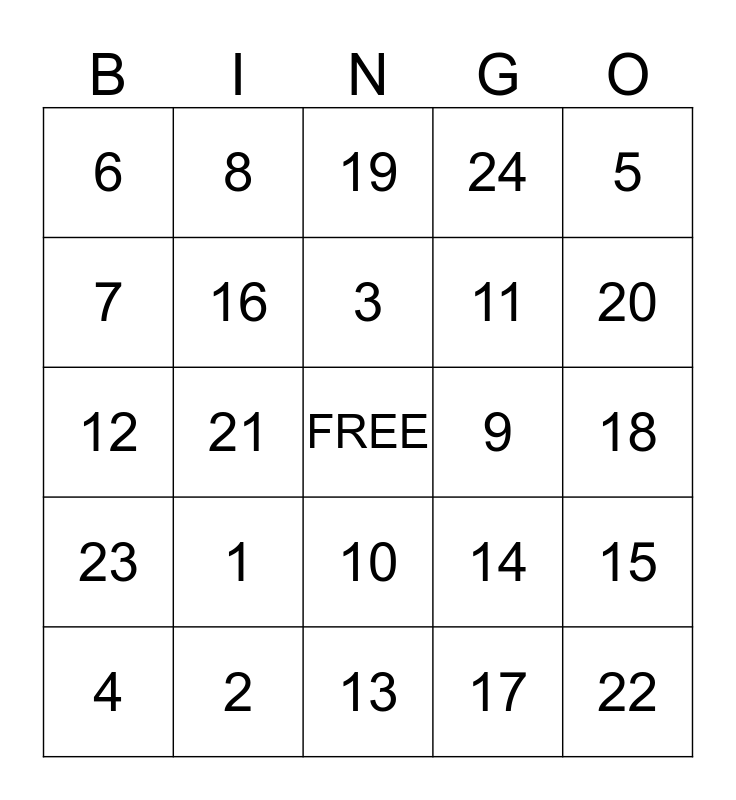 This bingo card has a free space and 24 words: 1, 2, 3, 4, 5, 6, 7, 8, 9, 10, 11, 12, 14, 15, 16, 17, 18, 19, 20, 21, 22, 23, 24 and 13.