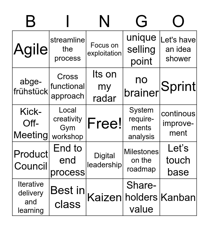 This bingo card has a free space and 29 words: Iterative delivery and learning, BBW full EMB inboard, Local creativity Gym workshop, Efficiency Backbone, Agile, Focus on exploitation, Cross functional approach, End to end process, System require-ments analysis, Best in class, continous improve-ment, Kanban, Kaizen, Share-holders value, Sprint, Scrum master, Digital leadership, Product Council, Let's have an idea shower, Kick-Off-Meeting, Milestones on the roadmap, rocket science, no brainer, abge-frühstück, unique selling point, streamline the process, Let’s touch base, Its on my radar and synergie effects.