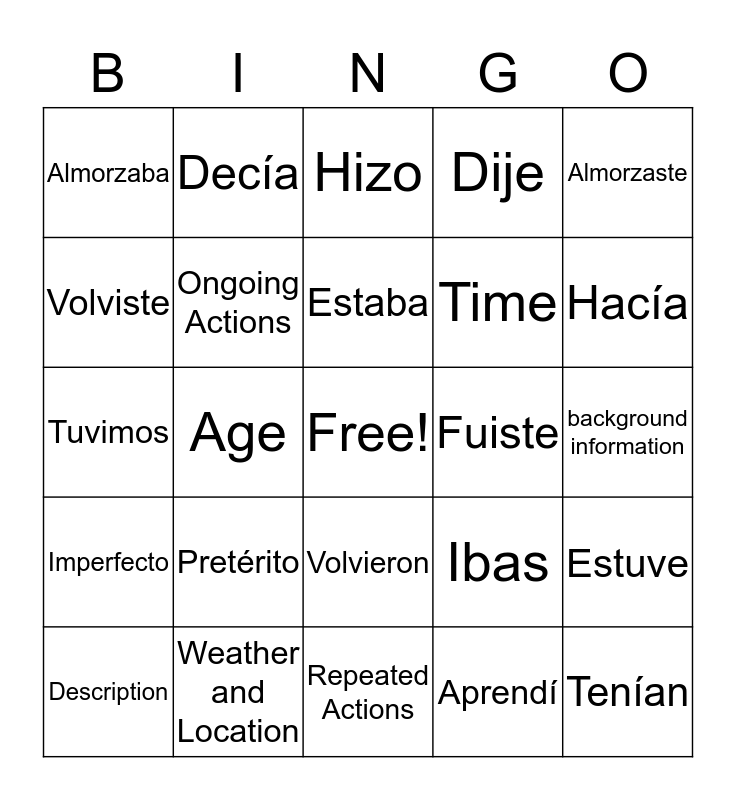 This bingo card has a free space and 29 words: Description, Aprendías, Age, Aprendía, Almorzaba, Hizo, Ongoing Actions, Pretérito, Fuiste, Weather and Location, background information, Tenían, Repeated Actions, Aprendí, Hacía, Emotions, Volvieron, Imperfecto, Almorzaste, Tuvimos, Ibas, Use to..., Time, Volviste, Dije, Decía, Estuve, Estaba and Estuviste.