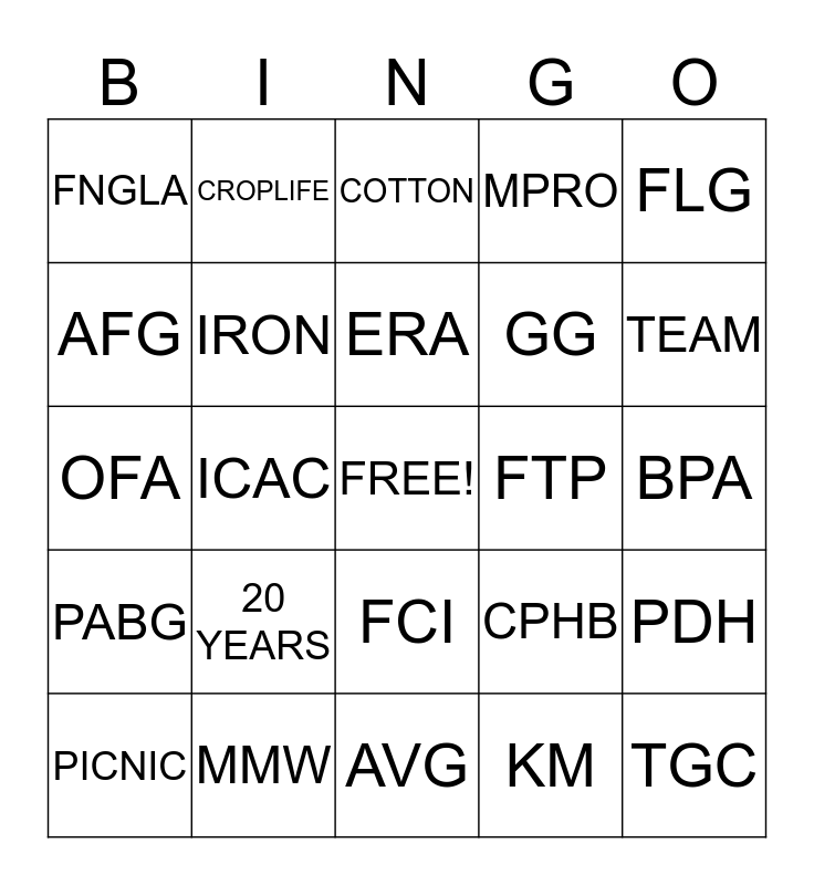 This bingo card has a free space and 24 words: 20 YEARS, MMW, ERA, PICNIC, FLG, FNGLA, AFG, CROPLIFE, FTP, FCI, GG, OFA, CPHB, PDH, IRON, KM, BPA, COTTON, TEAM, ICAC, TGC, PABG, MPRO and AVG.
