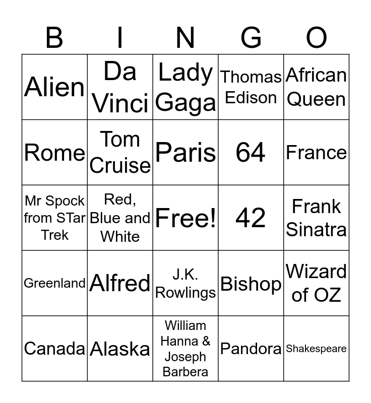 This bingo card has a free space and 24 words: Canada, Alfred, Paris, Pandora, African Queen, Alien, Da Vinci, Lady Gaga, 42, Frank Sinatra, Mr Spock from STar Trek, Tom Cruise, Bishop, Wizard of OZ, Rome, Alaska, William Hanna & Joseph Barbera, Thomas Edison, France, Greenland, Red, Blue and White, J.K. Rowlings, 64 and Shakespeare.