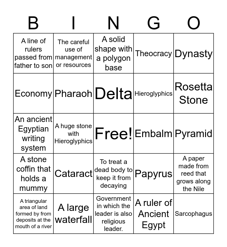 This bingo card has a free space and 24 words: Cataract, A large waterfall, Delta, A triangular area of land formed by from deposits at the mouth of a river, Dynasty, A line of rulers passed from father to son, Economy, The careful use of management or resources, Embalm, To treat a dead body to keep it from decaying, Hieroglyphics, An ancient Egyptian writing system, Papyrus, A paper made from reed that grows along the Nile, Pharaoh, A ruler of Ancient Egypt, Pyramid, A solid shape with a polygon base, Rosetta Stone, A huge stone with Hieroglyphics, Sarcophagus, A stone coffin that holds a mummy, Theocracy and Government in which the leader is also religious leader..
